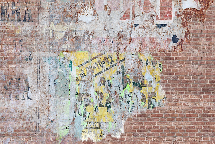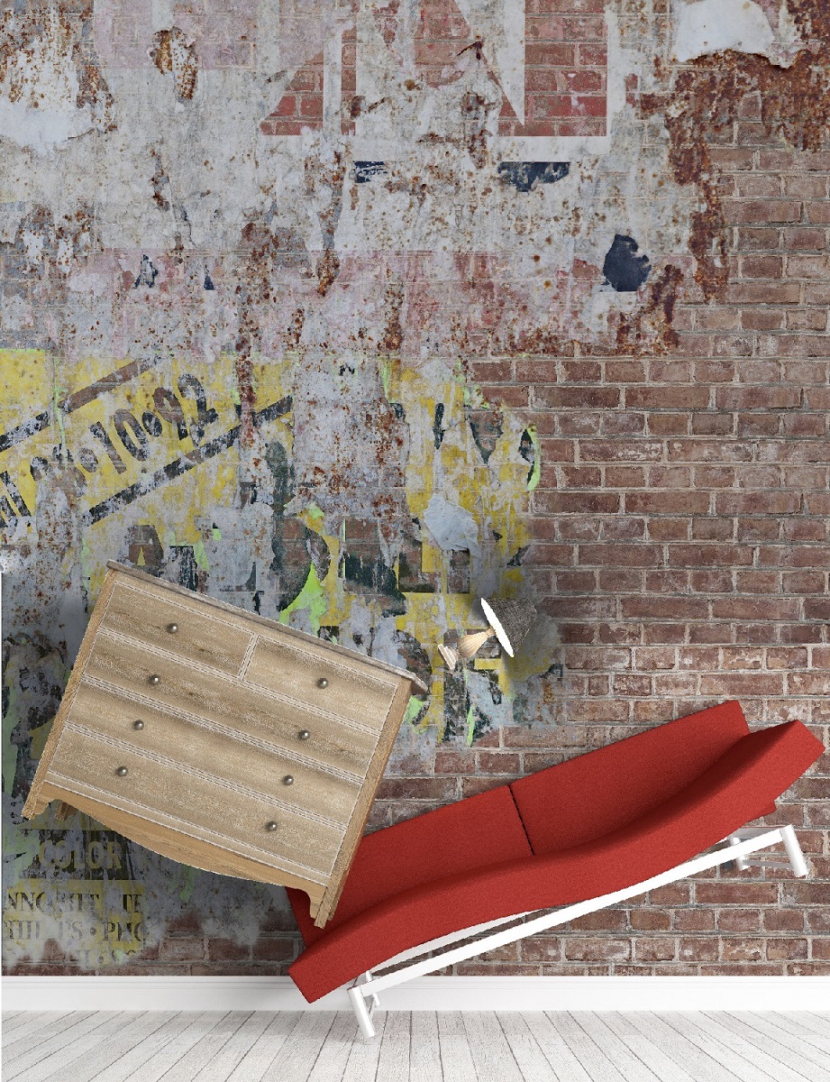 Decollage Wall is an industrial style mural  featuring a red brick wall with old posters on it.  This is an acoustic wallcovering mural.