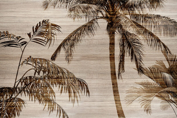 Add texture with Eden, a palm tree mural on a timber wood effect background. This is an acoustic wallcovering mural.