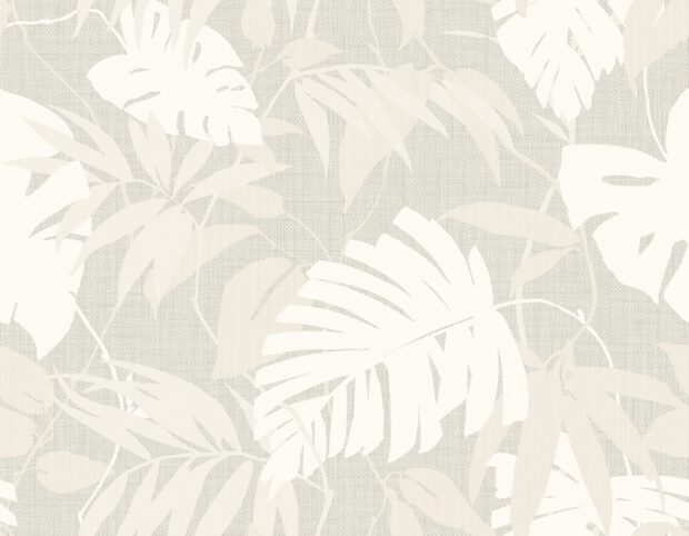 This textured wallpaper features varied types of leaves. It is a gravure print wallcovering with the appearance of the main design being printed on a natural fibre, woven backdrop.