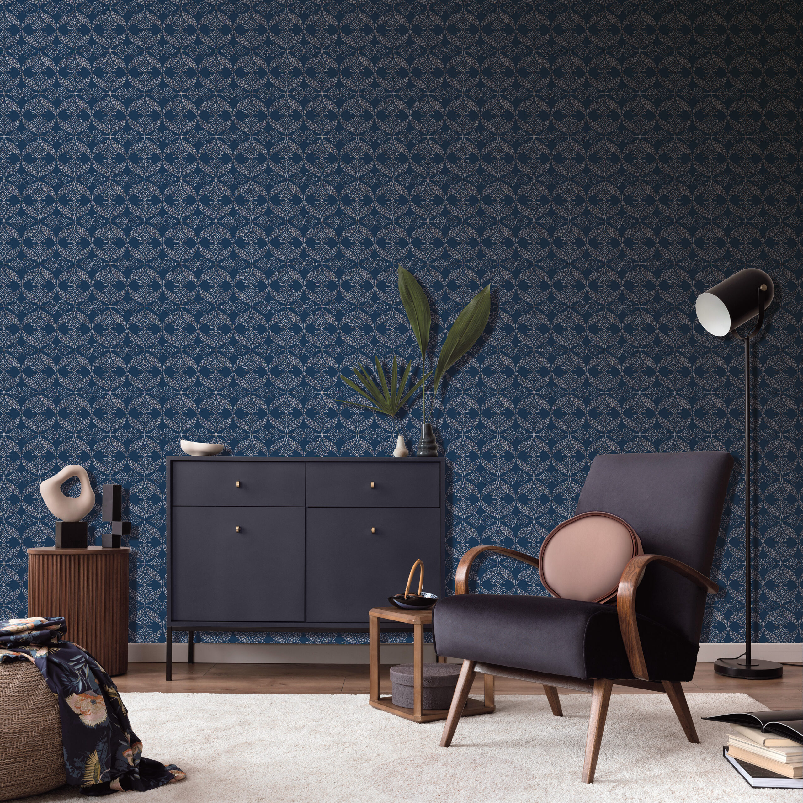 • Morocco inspired wallpaper in tiled motif pattern in blue tones