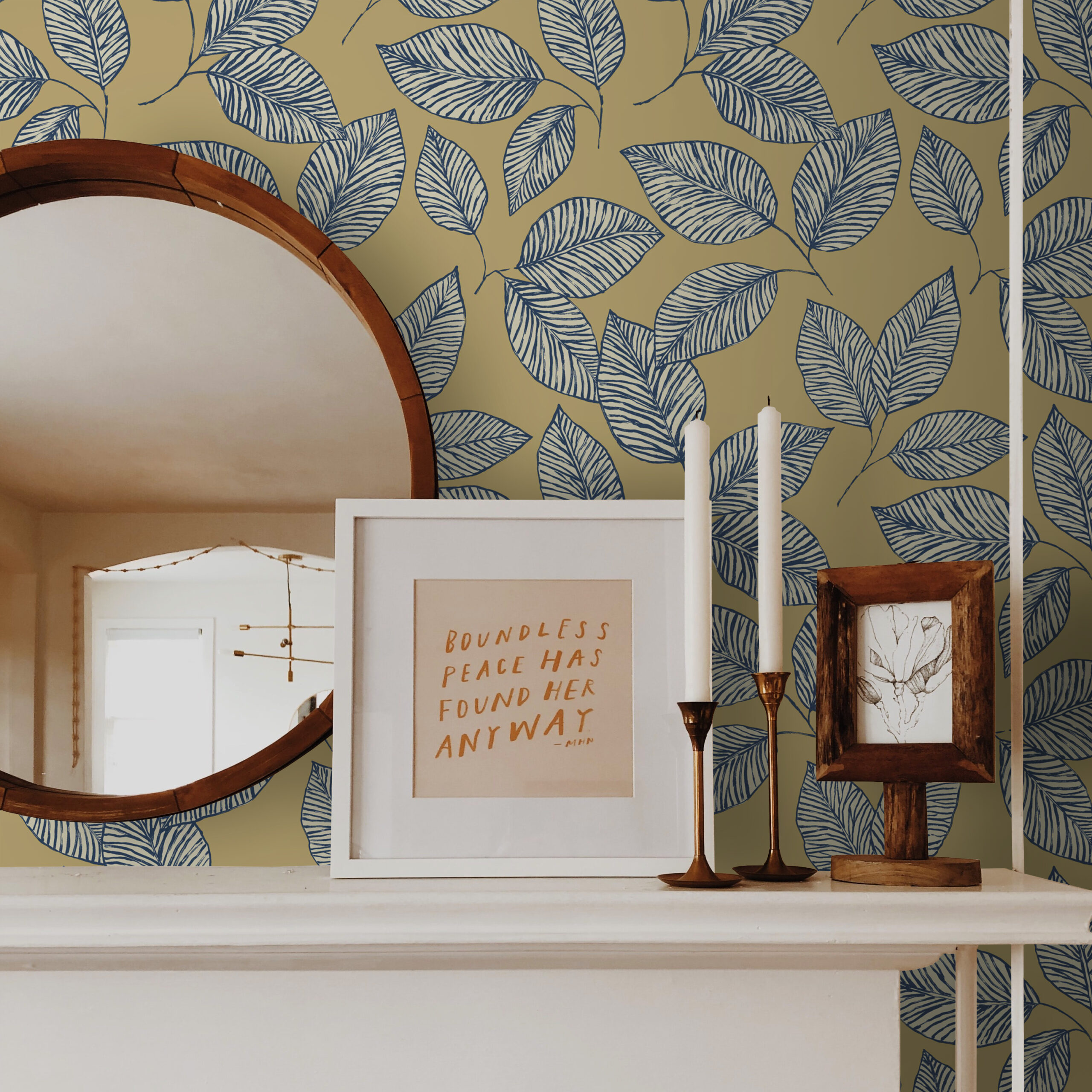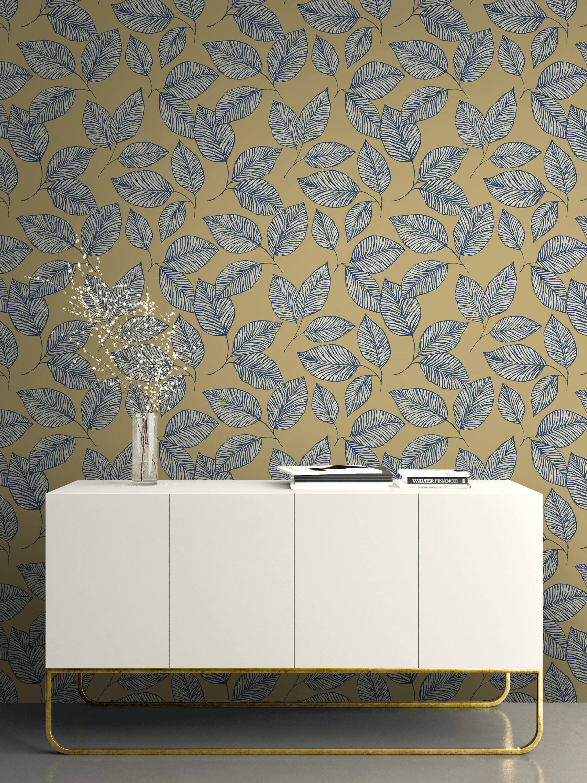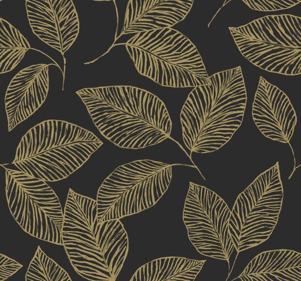 This contemporary yet timeless wallpaper features leaves in a graphic line painted composition. With imperfect paint brushstrokes that give a handmade aspect.